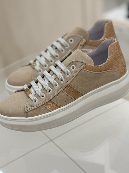 Sneaker in pelle scamosciata firmata Joann : alta qualità nel dettagli e dei materiali utilizzati. In questo particolare esempio abbiamo motivo in color rame alternato al colore di fondo sabbia , due toni che rendono la calzatura originale e diversa dal solito. 100% Made in Italy.
