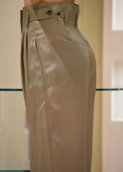 Pantalone in tripla organza di seta liscia dalla linea utility : vita alta regolabile ai lati , doppia pencès , gamba larga. Il capo risulta leggero ma anche strutturato per regalare una silhouette slanciata e valorizzata. Impeccabile abbinato alla blusa in lino con tema Iris oppure con la vostra t-shirt preferita.