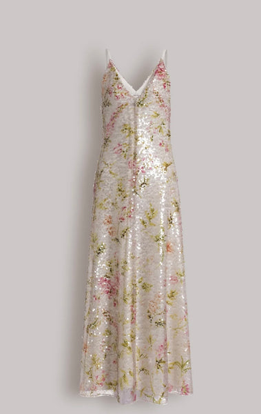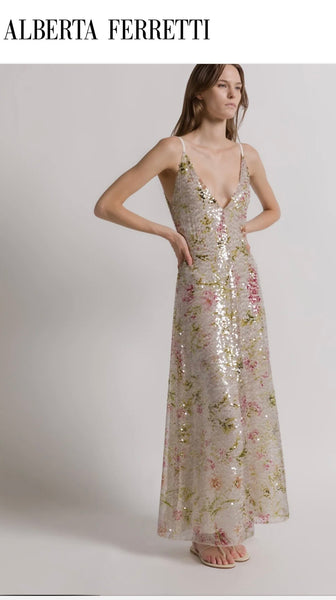 Femminile e romantico , questo abito lungo scivolato firmato Alberta Ferretti , è interamente ricoperto di paillettes stampate con un poetico motivo floreale ,in linea con il tema botanico di questa collezione. Un capo luminoso con stile e raffinatezza tutta Made in Italy.
