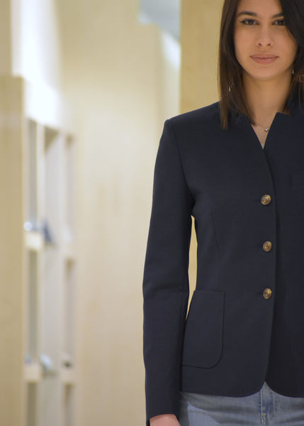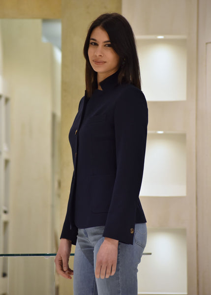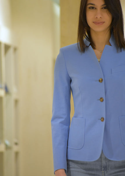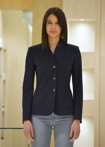 Confort con stile contraddistingue questa giacca in Jersey elasticizzato firmata Pratolivo : il collo a coreana regala un taglio deciso al capo , 'allacciatura a tre bottoni  con disegno corno , tasche applicate, vestibilità slim . 100% Sartoria Made in Italy.