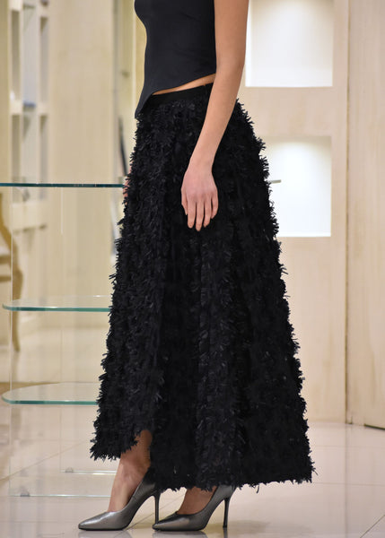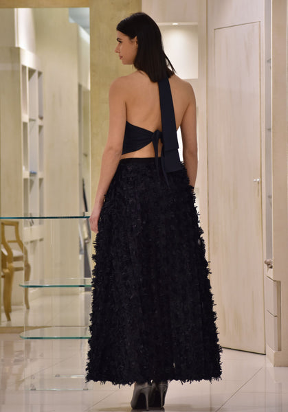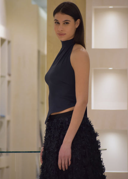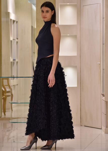 Originale e spumeggiante la gonna a ruota blu notte firmata Mason Co.Go. Un capo leggerissimo con apertura frontale a lato sormontata, scende leggermente a coda sul dietro. Il tessuto in misto viscosa presenta una lavorazione particolare  che ricorda vagamente la rafia . La cintura in vita presenta la chiusura a lato zippata ; competa di tasche questa gonna si rivela pratica al tempo stesso e versatile per una serata speciale.