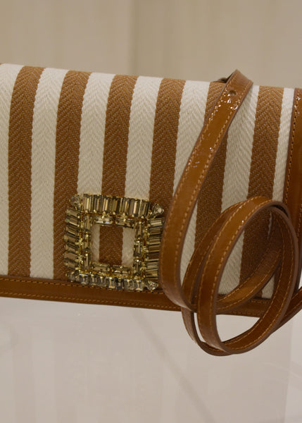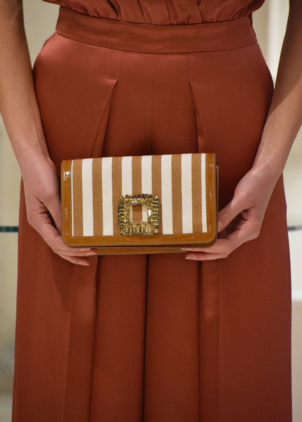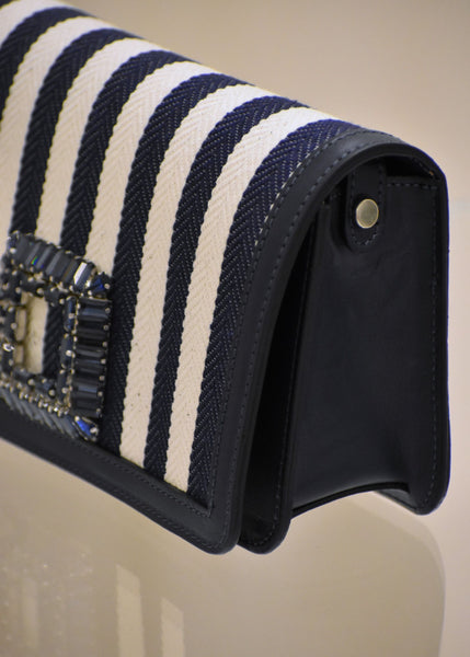 Mini bag firmata Roberto Festa realizzata il pelle e tessuto canvas a righe , di chiara ispirazione Primaverile . Competa di tracolla removibile è divisa da due scomparti al suo interno, la chiusura a pressione e fibbia con cristalli al sue esterno per un dettaglio glamour.