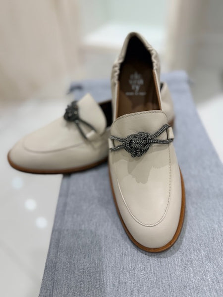 Mocassino in morbida pelle di vitello firmato Eleventy : tacco basso , calzata confort ,tallone elasticizzato , monile intrecciato sul collo della calzatura ad impreziosire un'accessorio pensato per essere utilizzato tutta la giornata con vari abbinamenti , proposto in un luminoso  color Avorio.